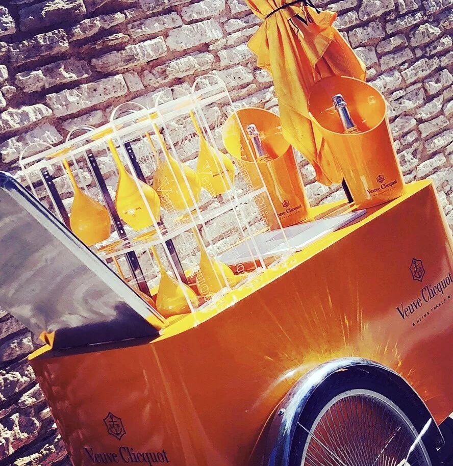 CHAMPAGNE CART BY VEUVE CLICQUOT Beach side at Nizuc, Mexico sits a fabulous hi-gloss orange pushcart featuring Veuve Clicquot champagne for self service. Complete with hi- gloss orange goblets, ice buckets, and, of course, matching umbrella-we are KOMPLETELY OBSESSED!! This item is not only on our favorites list. It is a total inspiration piece for what is coming soon to KliK Parties....because everything is better in orange-more so, everything is better on a roving push cart!